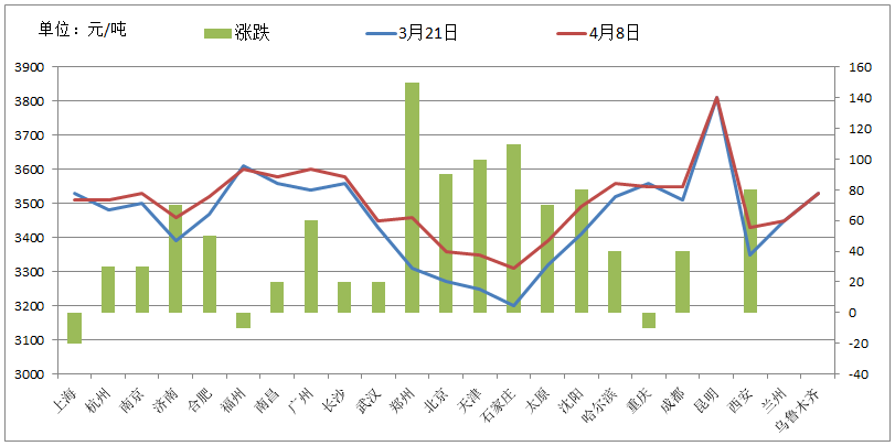 還記得在3月中旬的時(shí)候,筆者曾撰寫(xiě)過(guò)一篇關(guān)于異型管南北價(jià)差過(guò)大的文章,在文中筆者認(rèn)為北方中厚板生產(chǎn)企業(yè)鎖單價(jià)格已經(jīng)跌無(wú)可跌,北方中板市場(chǎng)價(jià)格也基本筑底。事實(shí)上自3月21日開(kāi)始,北方地區(qū)中厚板市場(chǎng)價(jià)格便開(kāi)啟了反彈之路,并在最近幾周漲勢(shì)進(jìn)一步擴(kuò)大。截止4月8日,國(guó)內(nèi)23個(gè)主要城市20mm普碳中板均價(jià)為3503元/噸,較3月21日上漲44元/噸,但部分北方地區(qū)中板價(jià)格漲幅已經(jīng)超過(guò)100元/噸。(如下圖)
